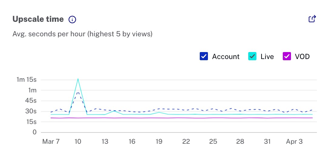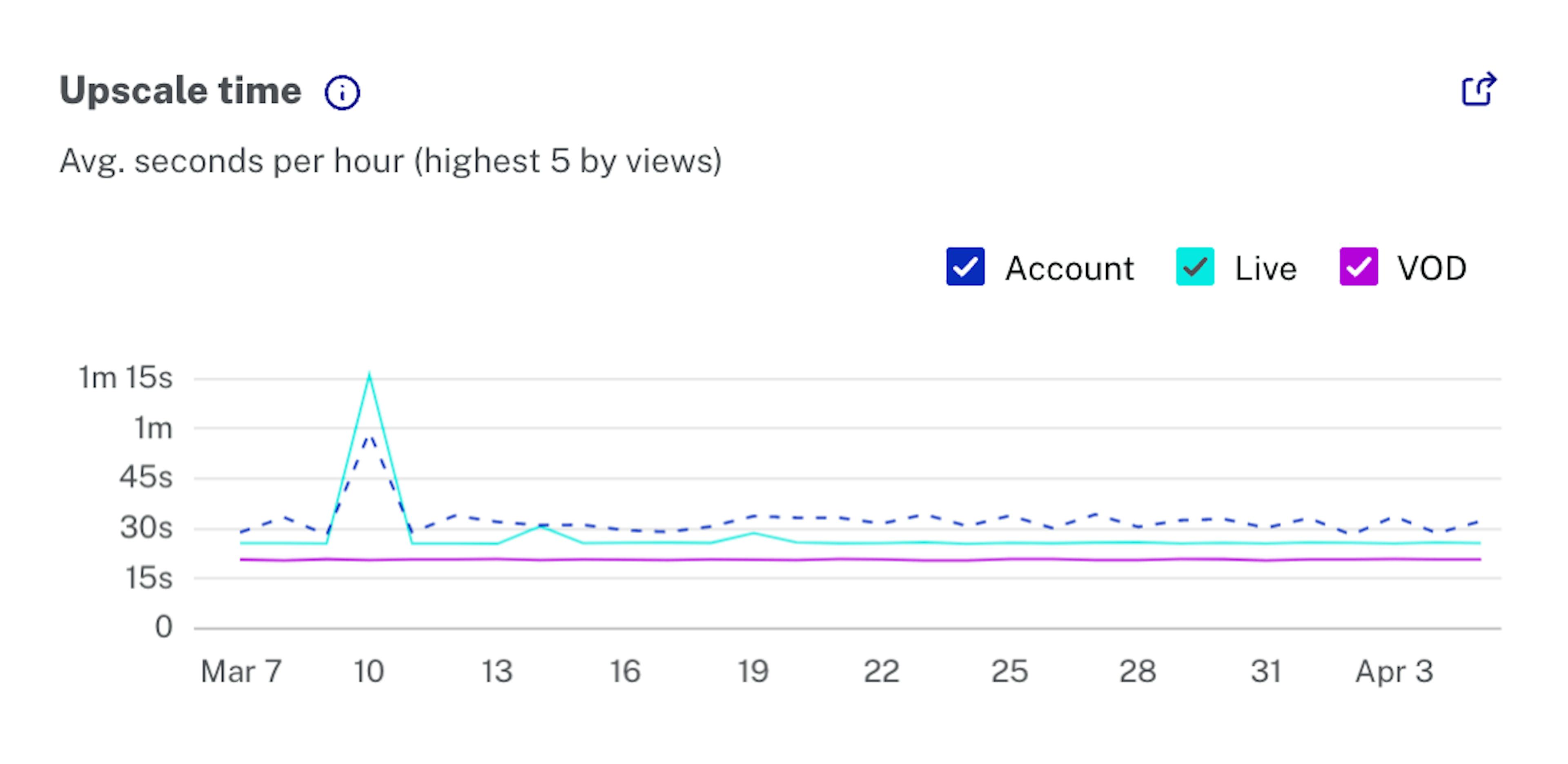 Upscaling time measures the average number of seconds per hour of viewing that is spent in an upscaled state. Upscaling occurs when a video rendition is streamed at a lower resolution than the playback device can display, often resulting in fuzziness or pixelation. This is particularly noticeable when a lower resolution stream is played on a large-screen device. Low upscaling time generally means your viewers are enjoying smooth, crisp video playback.