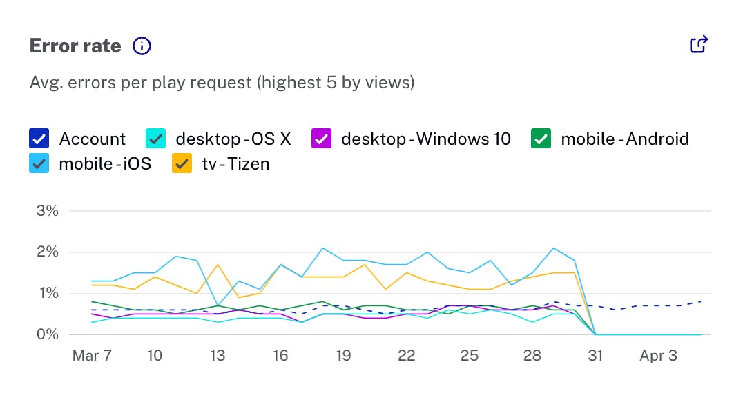 Error rate is the percentage of all play requests with errors preventing playback (as opposed to background errors the viewer doesn’t notice). These errors typically occur before playback begins, but they can also happen during playback. Low error rates mean that customers are usually able to watch the content they select.