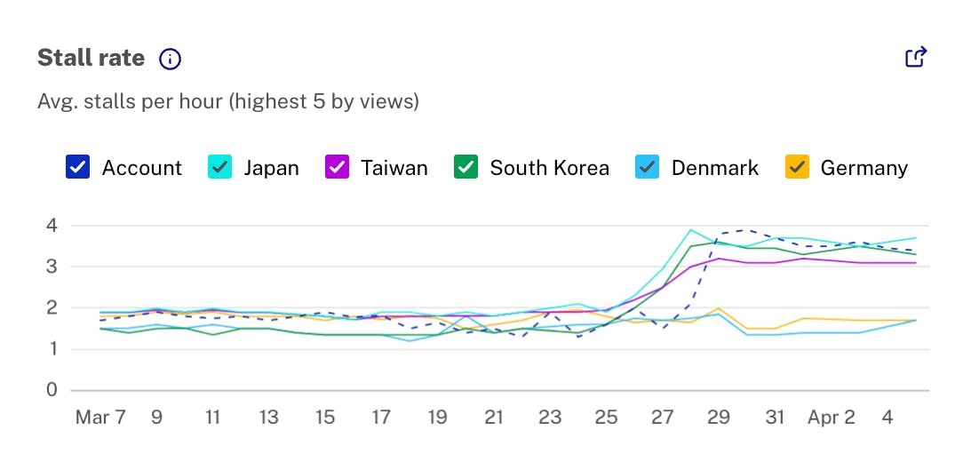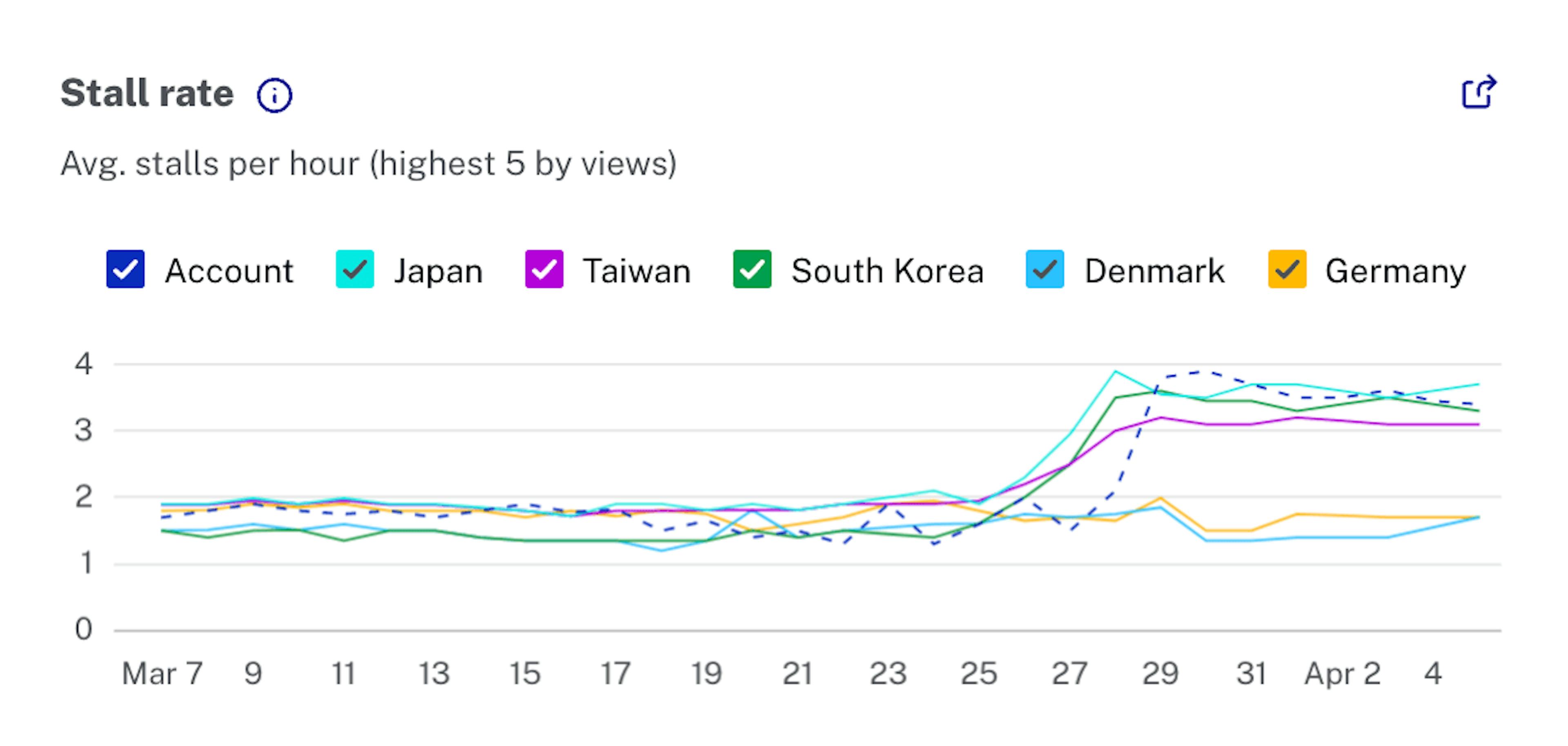 Stall rate is the average number of stalls per hour, calculated by comparing total stalls to total hours viewed in the selected time range. Unlike other rebuffering events, video stalls directly affect playback. This can manifest as single stalls of significant length or frequent stalls of varying length. Thus, a low stall rate means smoother playback and a better viewer experience.