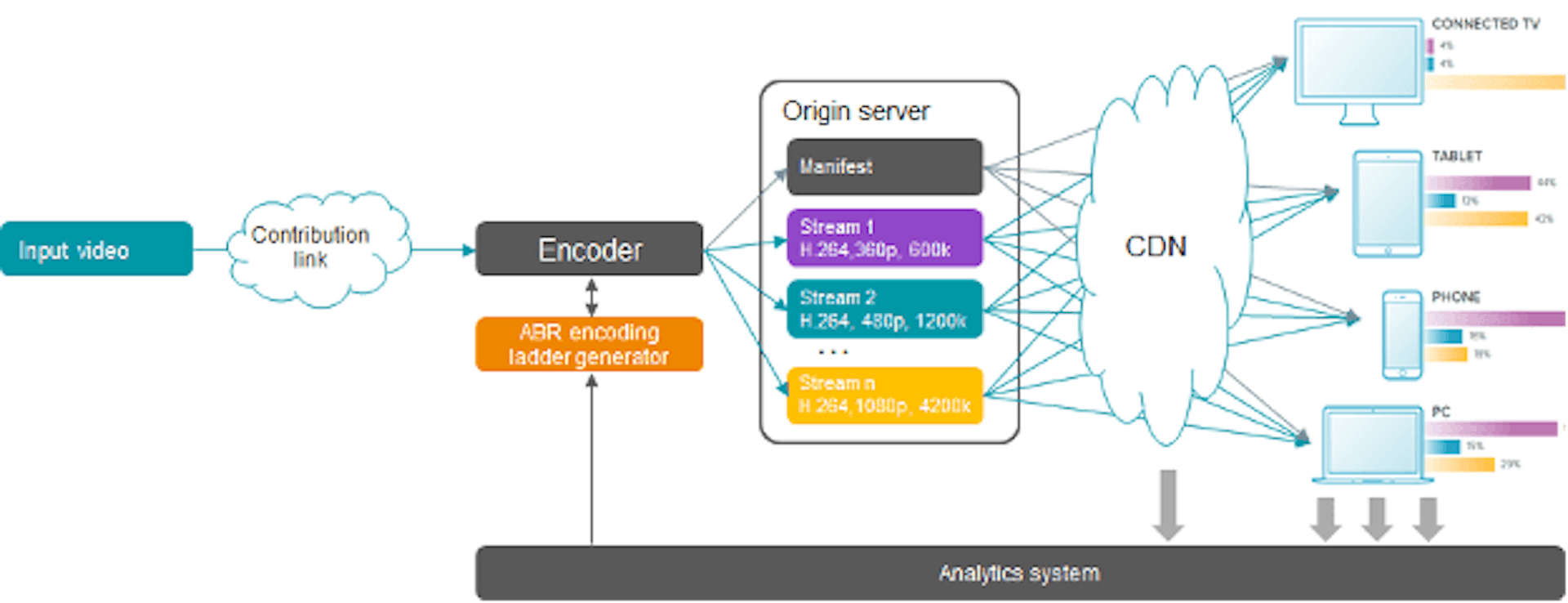 The system depicted in the above diagram has two additional components: The analytics system, which collects the playback statistics from CDNs and streaming clients, and the ABR encoding ladder generator, defining the number and properties of renditions to create. In the Brightcove Video Cloud system, this block corresponds to our Context-Aware Encoding (CAE) module.