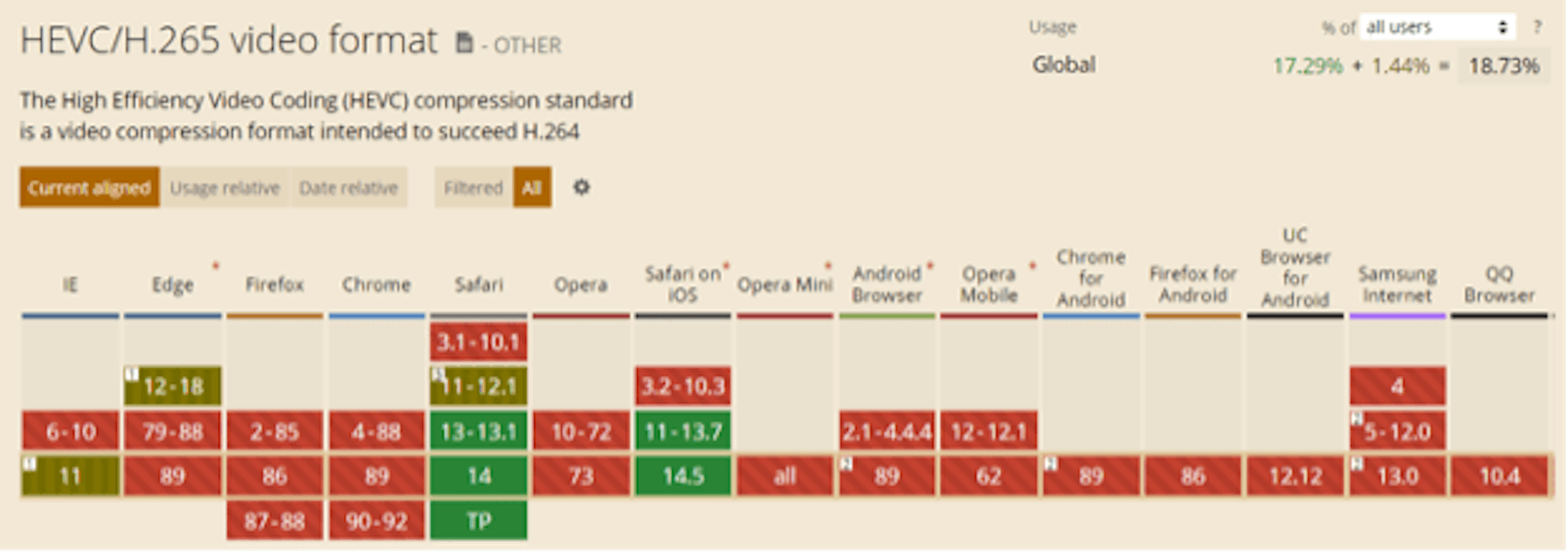 In theory, such gains should lead to a significant reduction in the costs of streaming. However, in practice, these new codecs can only reach particular subsets of the existing devices or web browsers. HEVC for example reportedly only has a reach of 18.73%, pointing mostly to Apple devices, and devices with hardware HEVC support. The AV1’s support among web browsers is higher, but notably, it is not supported by Apple devices and most existing set-top box platforms.