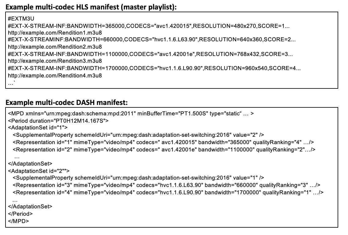 On the other hand, for newer devices capable of deciding both H.264/AVC and HEVC streams, the delivery system may produce a manifest including both H.264/AVC- and HEVC-encoded streams. The declaration of mixed codec streams in manifests is done according to the HLS and DASH-IF deployment guidelines. I show conceptual examples of such declarations below.