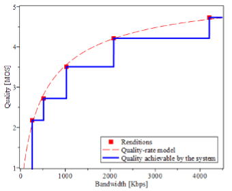 We next plot (bitrate, quality)- points corresponding to renditions, as well as the best quality achievable by the streaming system with varying network bandwidth. This becomes a step function, shown in blue.