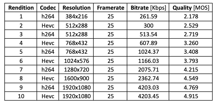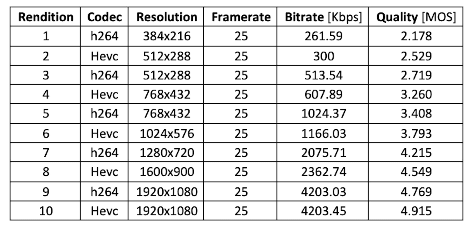 As easily observed, the encoding ladder defines five streams, enabling delivery of video with resolutions from 216p to 1080p and using about 260 to 4200Kbps in bandwidth. All streams are produced by the H.264/AVC codec. The last column in this table lists perceived visual quality scores as estimated for playback of these renditions on a PC screen. These values are reported using the Mean Opinion Score (MOS) scale. MOS score five means excellent quality, while score one means that the quality is bad.