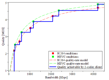 The plots of rendition points, quality-rate models, and quality achievable by streaming clients decoding H.264 and HEVC streams are presented in the below figure.