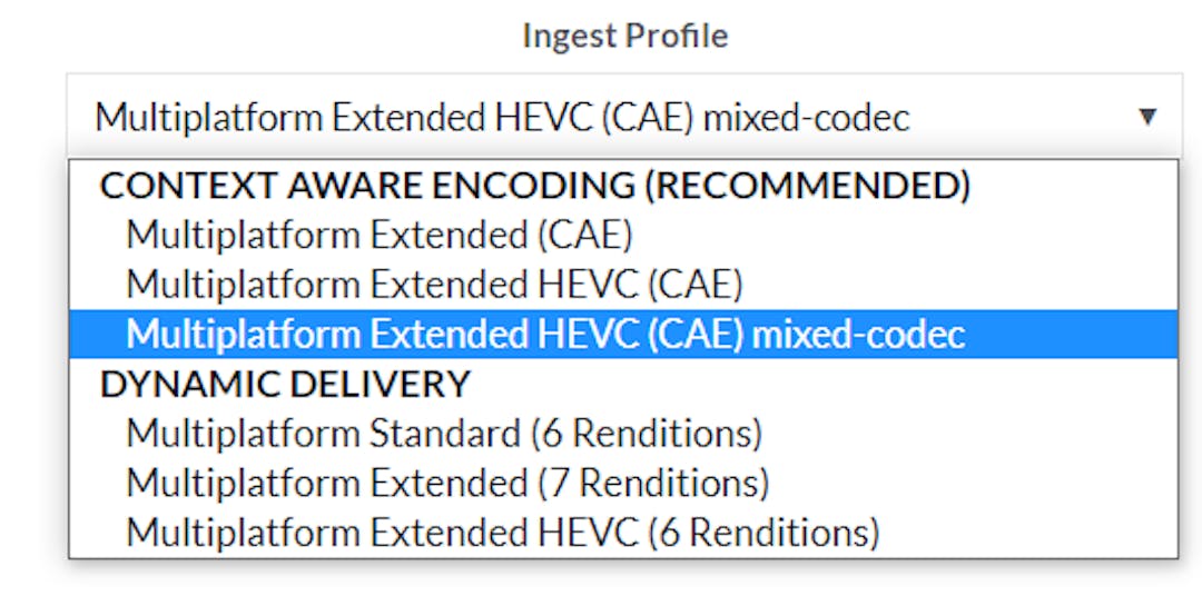 When the Multiplatform Extended HEVC (CAE) mixed-codec ingest profile is selected, the result will be a mixed codec ladder, with both H.264 and HEVC streams present. This profile can produce from three to 12 output streams for both codecs, covering the range of resolutions from 180p to 1080p and with bitrates in the range of 250Kbps to 4200Kbps. The CAE profile generator defines everything else automatically, based on characteristics of the content as well as playback statistics observed for the account.