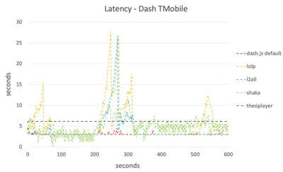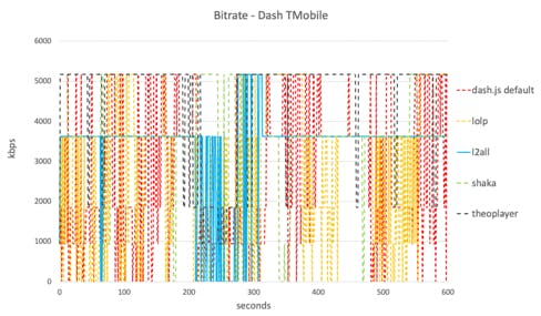 While LL-HLS and LL-DASH worked well in unconstrained network environments, they struggled in low bandwidth or highly variable networks (which are typical in mobile deployments). Observed effects included highly variable delays, inability to prevent buffering, and frequent bandwidth switches or inability to use the available network bandwidth. Some players simply switched into non-low-latency streaming under such challenging network conditions.