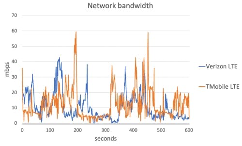 Figure 2. Available bandwidth of emulated LTE mobile networks (Verizon and T-Mobile)