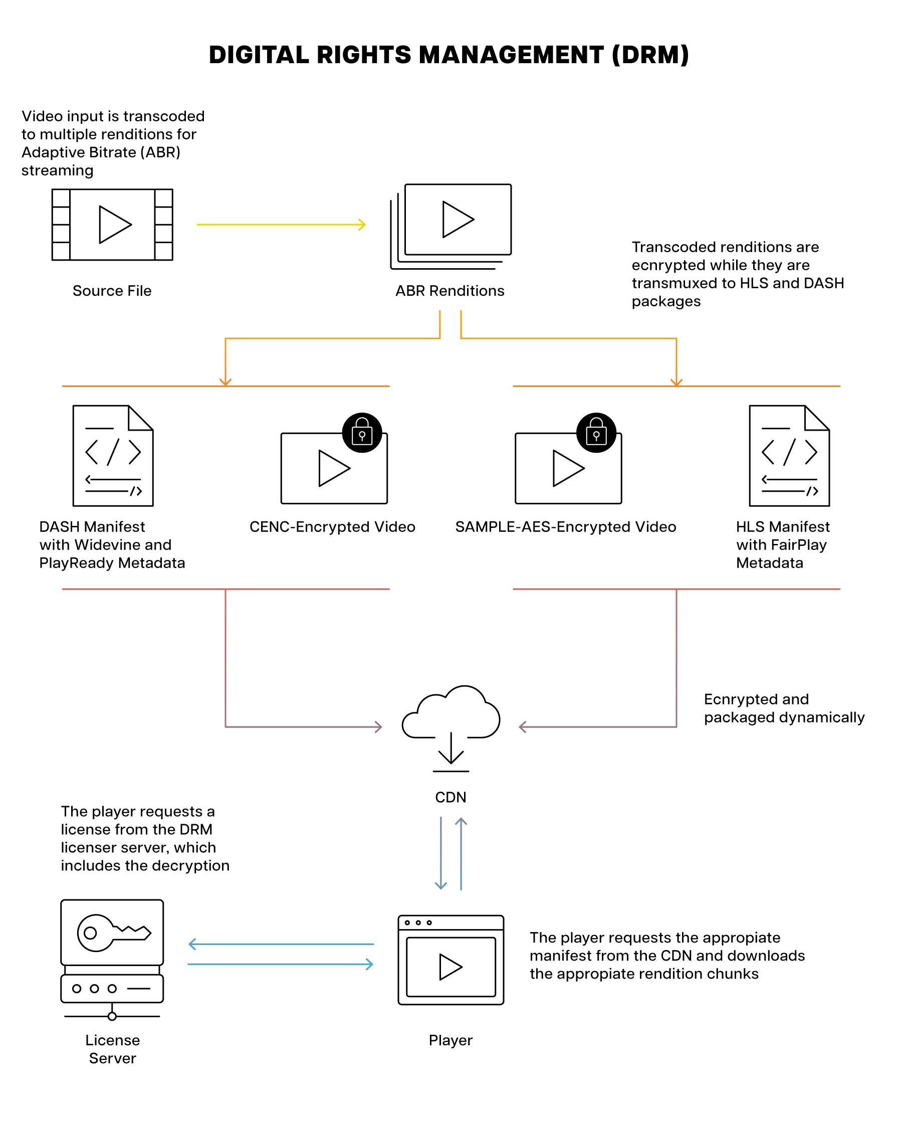 - Content. Your assets must be transcoded, encrypted, and packaged in formats compatible with the DRM technologies you need to support.