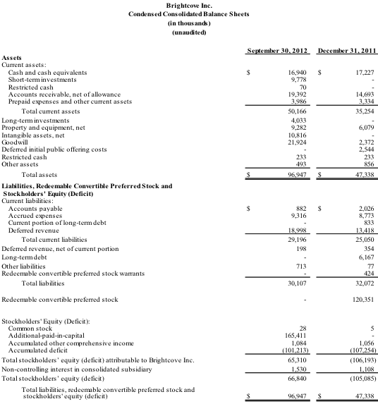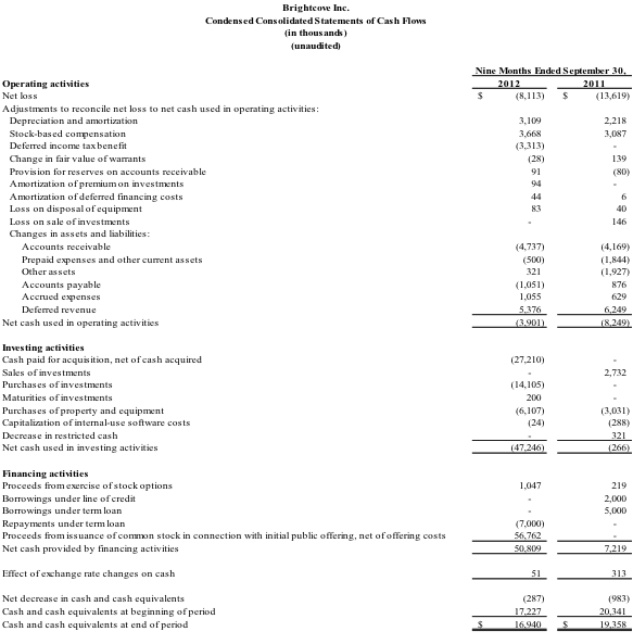 Balance y flujo de caja: A 30 de septiembre de 2012, Brightcove contaba con 30,8 millones de dólares en efectivo, equivalentes de efectivo e inversiones, lo que supone un descenso con respecto a los 58,6 millones de dólares a 30 de junio de 2012. La disminución de efectivo se debió principalmente a los 27,2 millones de dólares utilizados para la adquisición de Zencoder.