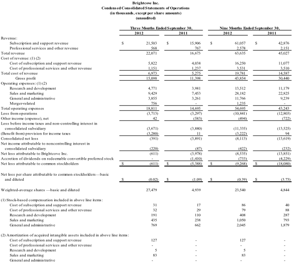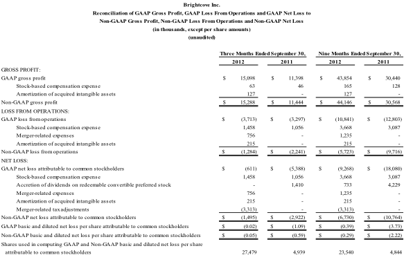 Cuarto trimestre de 2012*: La Compañía espera unos ingresos de entre 22,8 y 23,3 millones de dólares, y unas pérdidas de explotación no-GAAP de entre 1,9 y 2,2 millones de dólares. Asumiendo aproximadamente 27,9 millones de acciones en circulación, Brightcove espera que su pérdida neta no-GAAP por acción básica y diluida sea de 0,07 a 0,08 dólares.
