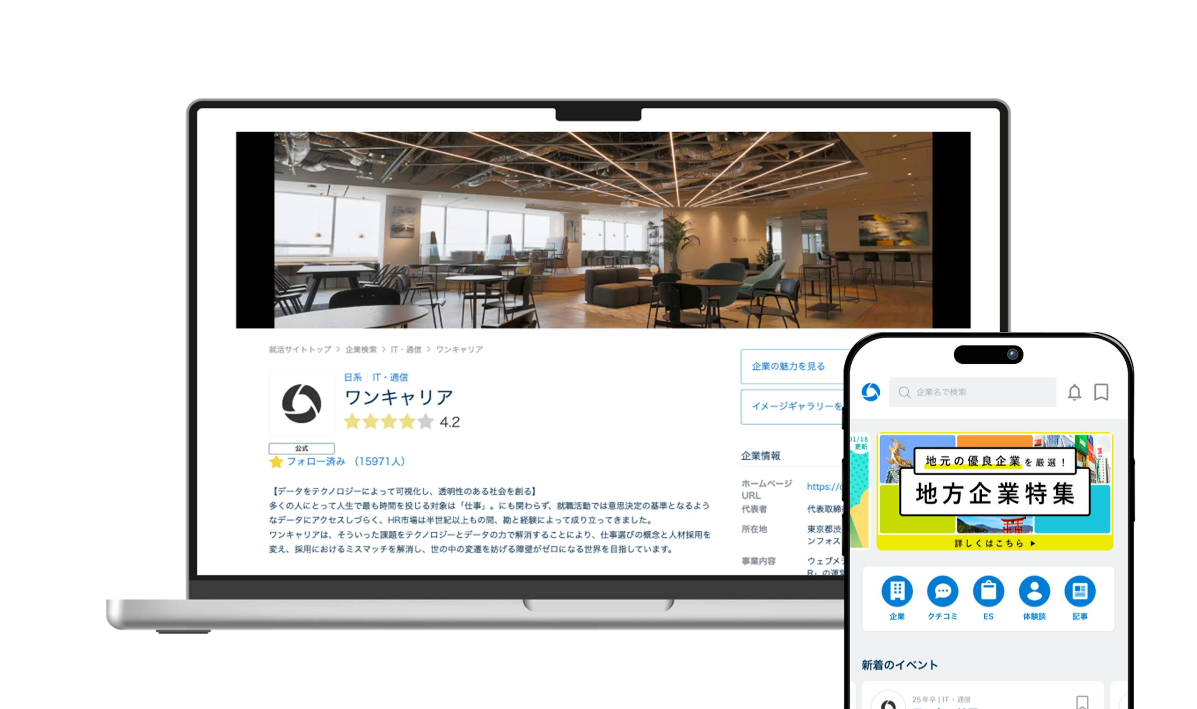 「人の数だけ、キャリアをつくる。」をミッションに、IT×HR領域でさまざまなサービスを展開する株式会社ワンキャリア。新卒者向けの就 活 サイト「 ONE CAREER 」や 転 職 希 望 者 向 け の 転 職 サイト「ONE CAREER PLUS 」、企 業 の 人 事 向 け の「 ONE CAREER CLOUD」といったサービスを提供しています。