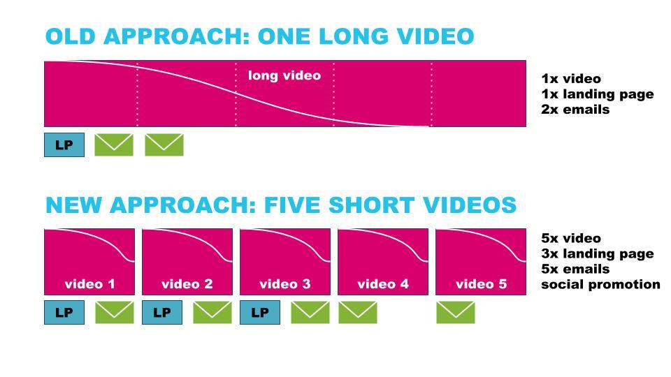We took this approach recently with a series of product demos in our trial experience. Typically we would create one sweeping product overview video that would cover the solution in detail for 5-7 minutes, but the challenge there is you lose a lot of flexibility. You have one mammoth asset you’ll put on one landing page and one or two emails. And, with shrinking attention spans we were seeing significant drop off in play rate and engagement.