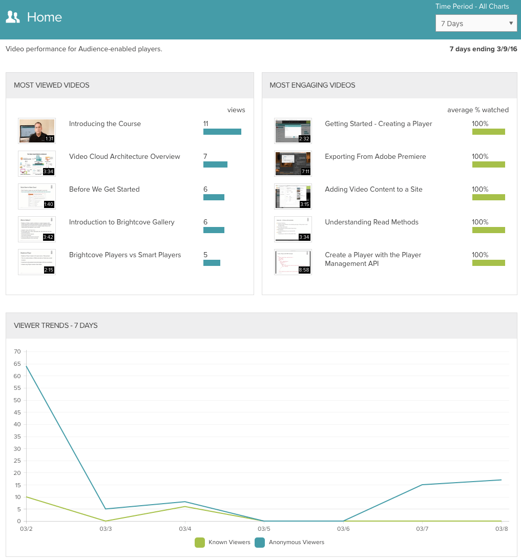 We’ve listened to customer feedback and introduced a new dashboard within the Audience tab to help you visualize the data collected by Audience. This dashboard provides a quick and intuitive overview of the performance of your Audience-enabled video players. Key reports include:
