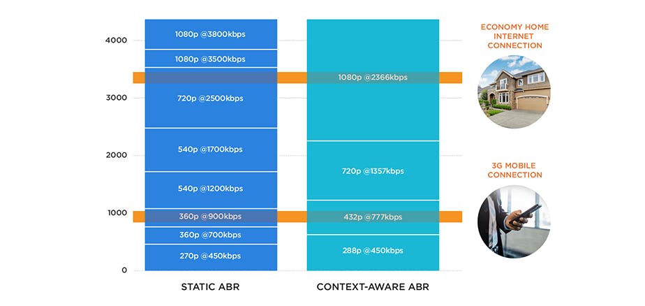 Similarly, a user with an economy-priced residential internet plan supplying 3,000kbps of sustained bandwidth would top out at the 720p rendition under the static ABR ladder, while they would be able to stream at full 1080p using CAE, delivering a Full HD experience.