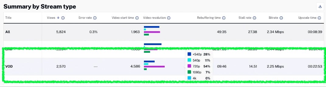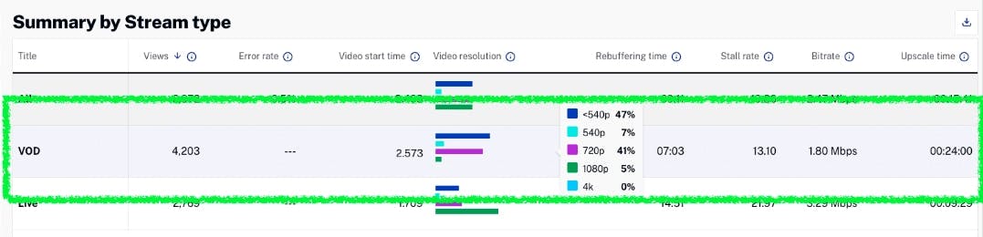 QoE Insights provided detailed reporting on what stream variants were being delivered by device across the viewing audience. With this data, we could clearly see the streaming bandwidth required to reach the audience as well as what renditions were driving bandwidth consumption.