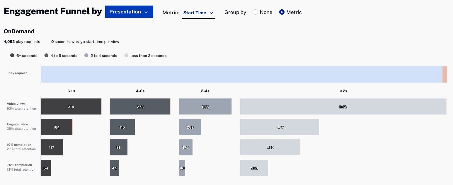 Of 4,092 total play requests, only 164 (4%) became engaged viewers if the video start time exceeded 6 seconds. Contrast that with 987 (24%) engaged viewers when the Video Start Time was less than 2 seconds. Simply improving video start time results in a 600%+ increase in engaged viewers.