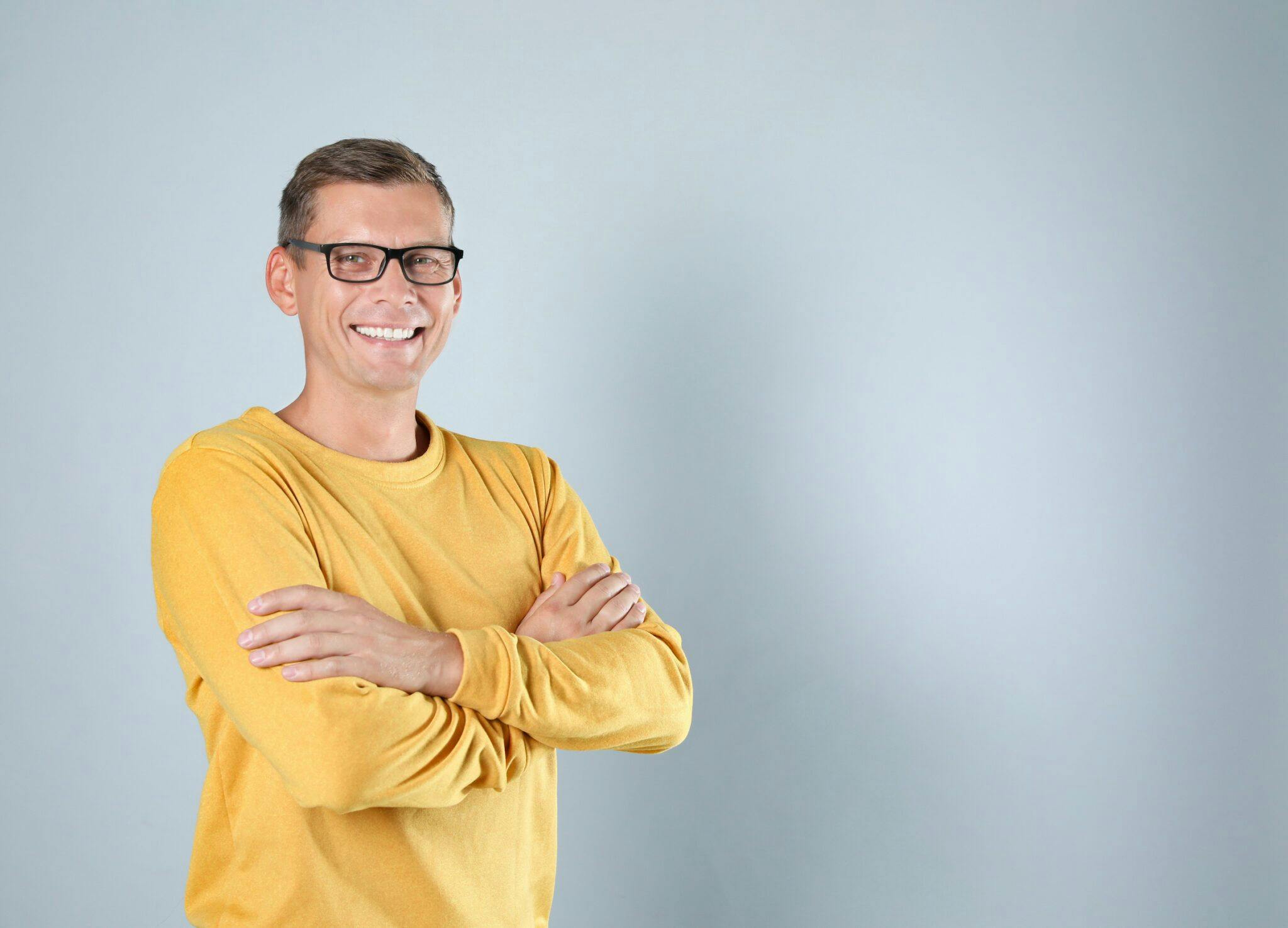 Man in stylish yellow sweatshirt on grey background, space for text