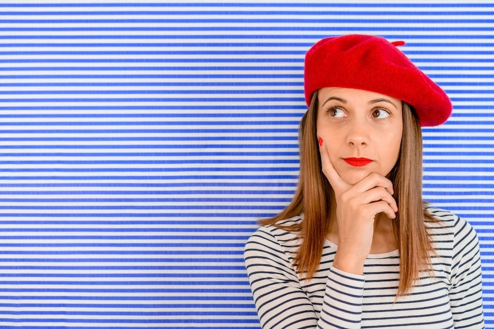 Woman with red nails, lipstick and hat standing in front of stripped background. She has t shirt with same pattern. Woman looks like she is wondering. Facial expression.