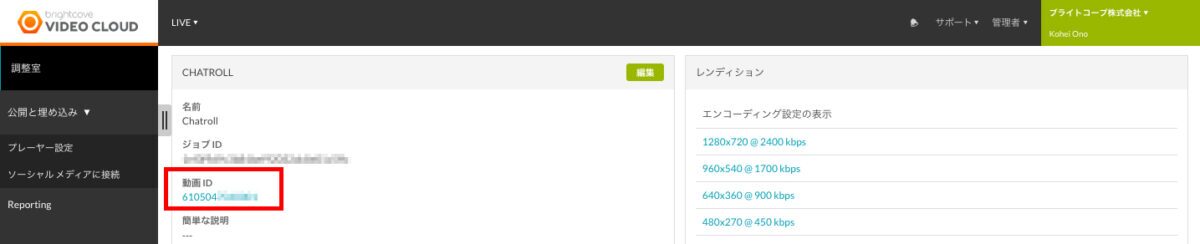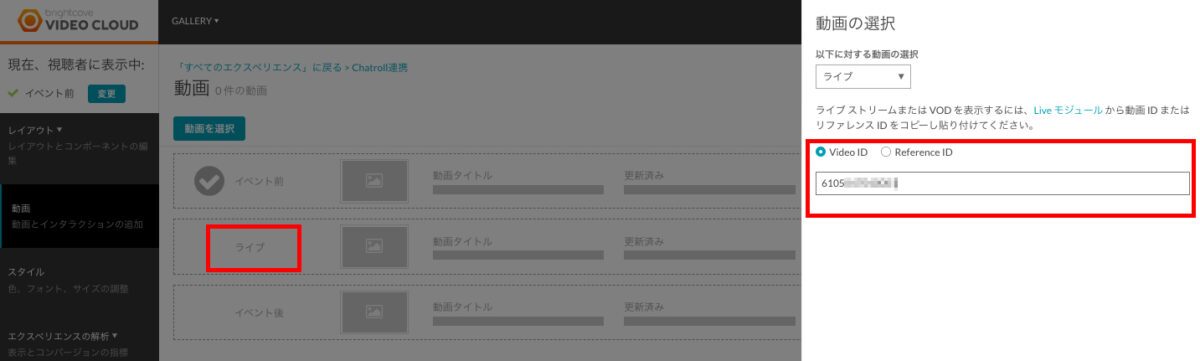 In this article, we will not be covering the method of live streaming (how to create a live event) itself. For more details, please check [here](https://ja.live.support.brightcove.com/live-module/creating-and-managing-live-events-using-live-module.html “here”). After creating an event with the Live module, please copy the “Video ID” displayed in the “Control Room” of the event.