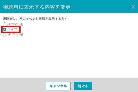 This is not a bug, but is because the settings in the Gallery module are set to the state before the live broadcast starts (before the event). After confirming that the live broadcast has started on the Live module, click on “Change” next to “Before the event” in the top left of the Gallery module, and the “Change what viewers see” pop-up will appear. After selecting the “Live” radio button, click on “Continue”.