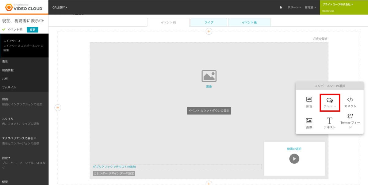 In this example, we will set it so that the Chatrol chat screen set in the first part is displayed on the right side of the video player where the live video is being streamed. If you click on the “+” button displayed on the right, a screen called “Select Component” will appear, so please click on “Chat”.